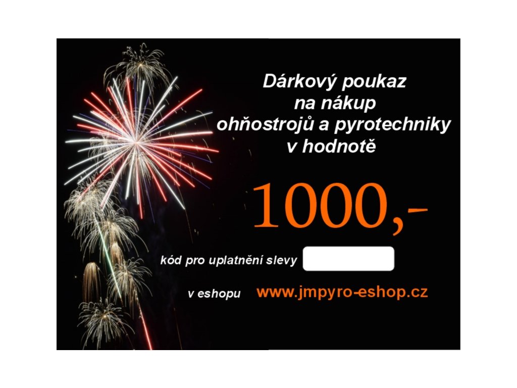 Dárkový poukaz na nákup pyrotechniky a ohňostrojů v hodnotě 1000,- Kč, platnost poukazu je 6 měsíců, slevový kód poukazu bude zaslán elektronicky po jeho zaplacení.